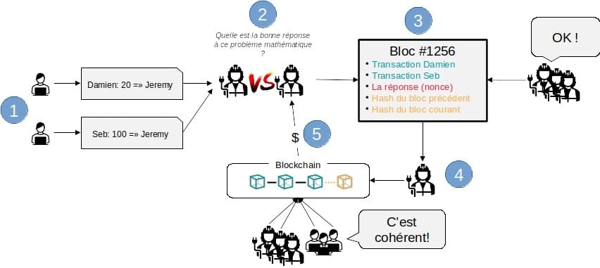 - Une catégorie spécifique de nœuds (appelés les « mineurs ») va récupérer ces transactions en attente. Leur rôle est d’inscrire cette transaction dans la Blockchain (le registre distribué). Pour cela, ils vont d’abord vérifier les demandes de transactions (cette transaction est-elle valide ? Damien a-t-il les fonds suffisants pour réaliser sa transaction ? La transaction de Damien a-t-elle bien été signée par Damien ?) et les regrouper dans un bloc (pour les inscrire toutes d’un coup). Toutefois, pour avoir le droit d’inscrire ce nouveau bloc dans la Blockchain, les mineurs devront résoudre un problème mathématique complexe (mais dont la réponse est facilement vérifiable).