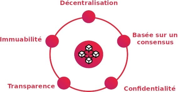 - Décentralisation : chaque nœud du réseau (ordinateur participant au réseau) est indépendant et autonome. Cela permet non seulement d'assurer la redondance de la donnée (elle est enregistrée partout, garantissant ainsi sa disponibilité) mais aussi l'authenticité de cette donnée. Car chaque donnée est inscrite dans le registre de chaque nœud, permettant à chaque nœud d'avoir sa propre copie, identique à celle des autres.