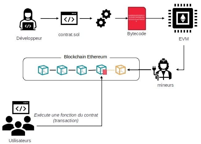 Dans l’illustration ci-dessus, voit qu’un smart contract peut être déployé sur la Blockchain en suivant le même processus que pour une transaction monétaire. Le smart contract est ajouté à un bloc, créé par un mineur puis ajouté de façon permanente à la Blockchain : il ne peut être supprimé, censuré ou modifié et vivra aussi longtemps que la Blockchain sur laquelle il est inscrit.
