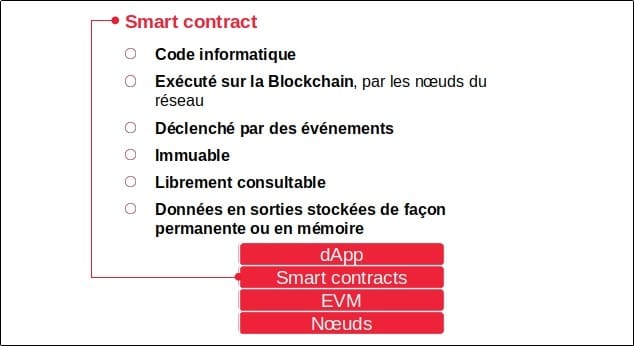 On peut définir un smart contract comme étant du code informatique exécuté sur la Blockchain par les nœuds du réseau et déclenché par des événements (autrement dit, un smart contract ne tourne pas « tout seul », il doit être appelé). Etant exécuté sur la Blockchain, ce code est donc :